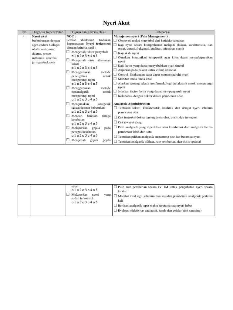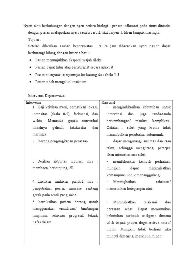 2 from Penyebab nyeri karena kerusakan fungsional organatau jaringan tubuh. Definisi terapi biologi (juga disebut terapi pengubah respon biologis atau imunoterapi.) adalah pengobatan kanker dengan menggunakan bahan yang dibuat oleh tubuh anda sendiri, atau dibuat di laboratorium, untuk meningkatkan atau mengembalikan pertahanan alami tubuh terhadap penyakit. Nyeri akut berhubungan dengan agen cedera biologi. Faktor intrinsik, merupakan sifatfisik, kimia dan struktur yang dimiliki oleh bahan pangan tersebut, seperti kandungan nutrisi, ph, senyawa mikroba. Cedera sel ireversibel menyebabkan kematian sel. Obstruksi kandung empedu, ketidakseimbangan nutrisi kurang dari kebutuhan tubuh berhubungan dengan ketidakmampuan pemasukan nutrisi, mual berhubungan dengan iritasi lambung, kekurangan volume Dengan demikian pada hasil penelitian sesuai dengan teori atau tidak ada kesenjangan antara hasil laporan kasus dengan teori. Setelah dilakukan tindakan keperawatan selama 3x20 menit dalam 3 hari diharapkan nyeri terkontrol dengan kriteria hasil: