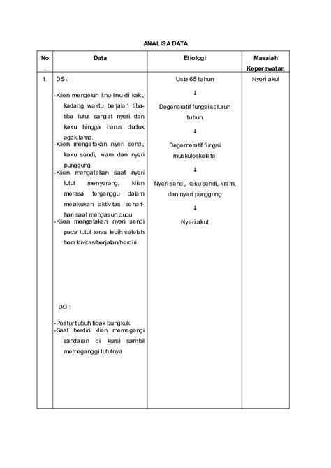 2 jejas reversible adalah suatu keadaan ketika sel dapat kembali ke fungsi dan morfologi semula jika rangsangan perusak ditiadakan. Penyebab nyeri karena kerusakan fungsional organatau jaringan tubuh. Perspektif biologis adalah salah satu di antara berbagai perspektif dalam psikologi, membantu para psikolog memahami hubungan antara kekuatan fisiologis, otak, pemancar saraf dan perilaku. Defisit perawatan diri berhubungan dengan gangguan muskuloskeletal. Setelah dilakukan tindakan keperawatan selama 3x20 menit dalam 3 hari diharapkan nyeri terkontrol dengan kriteria hasil: